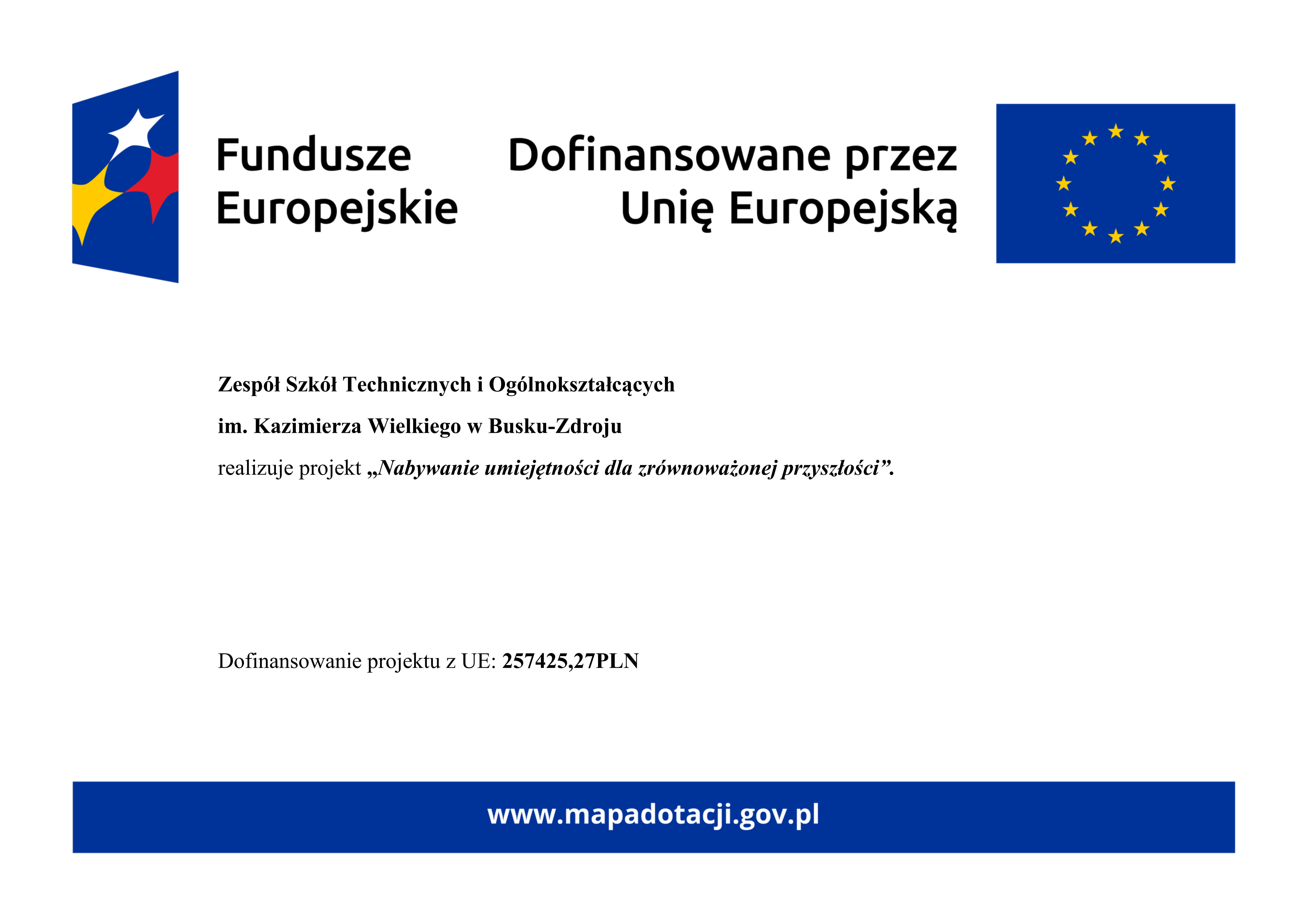 Z radością informujemy, że Zespół Szkół Technicznych i Ogólnokształcących w Busku-Zdroju przystępuje do realizacji innowacyjnego projektu „Zagraniczna mobilność edukacyjna uczniów i absolwentów oraz kadry kształcenia zawodowego”. Projekt jest współfinansowany ze środków Unii Europejskiej w ramach programu Fundusze Europejskie dla Rozwoju Społecznego 2021-2027, a jego numer to 2024-1-PL01-KA122-VET-000215619.
